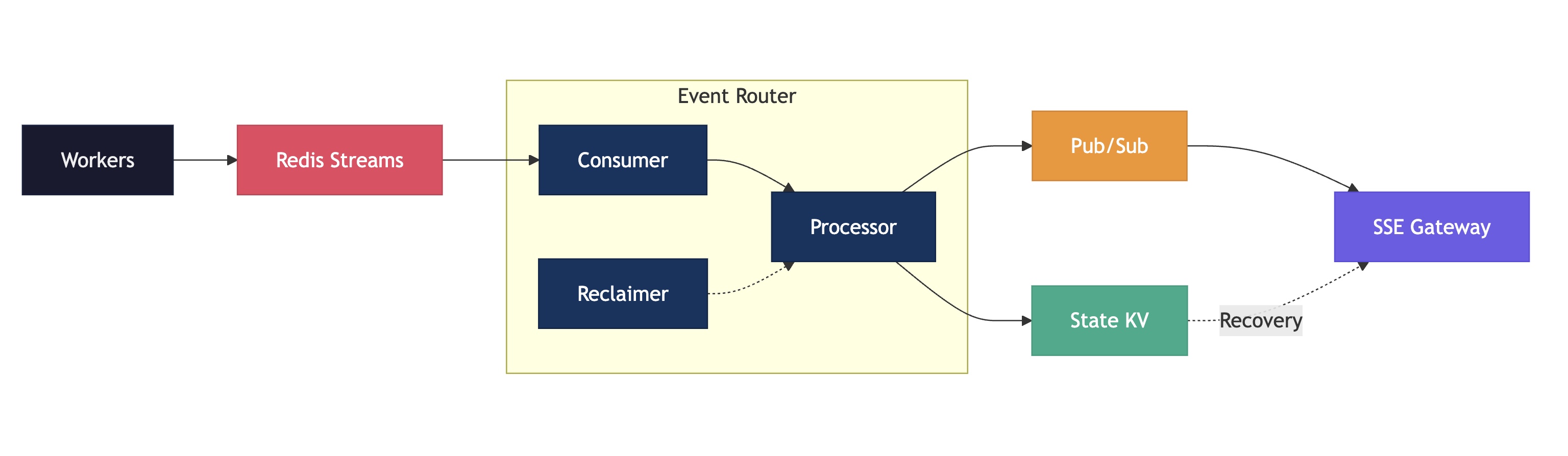 domains/event-router/ ├── main.py # FastAPI 앱 진입점 ├── config.py # 환경 설정 ├── core/ │ ├── consumer.py # StreamConsumer (XREADGROUP) │ ├── processor.py # EventProcessor (Lua + Pub/Sub) │ └── reclaimer.py # PendingReclaimer (XAUTOCLAIM) ├── tests/ ├── Dockerfile └── requirements.txt