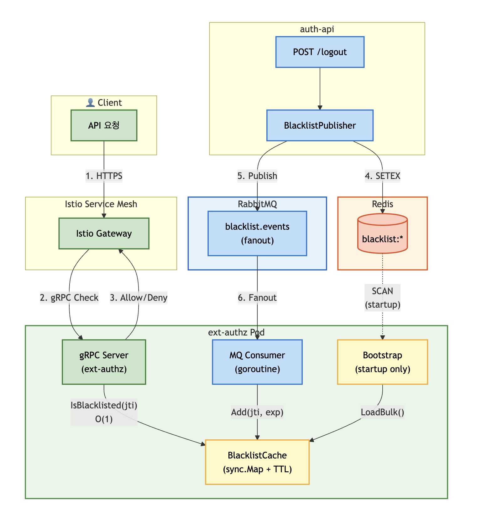 ┌──────────────────────────────────────────────────────────────────┐ │ 로컬 캐시 조회 (Redis 호출 0) │ └──────────────────────────────────────────────────────────────────┘ Client → Istio Gateway → ext-authz → Local Cache (in-memory map) │ └─ O(1) lookup ┌──────────────────────────────────────────────────────────────────┐ │ MQ 기반 캐시 동기화 │ └──────────────────────────────────────────────────────────────────┘ auth-api (logout) │ └─→ RabbitMQ (blacklist.events fanout) │ ├─→ ext-authz Pod 1: cache.Add(jti, exp) ├─→ ext-authz Pod 2: cache.Add(jti, exp) └─→ ext-authz Pod N: cache.Add(jti, exp)2.2 컴포넌트 구성