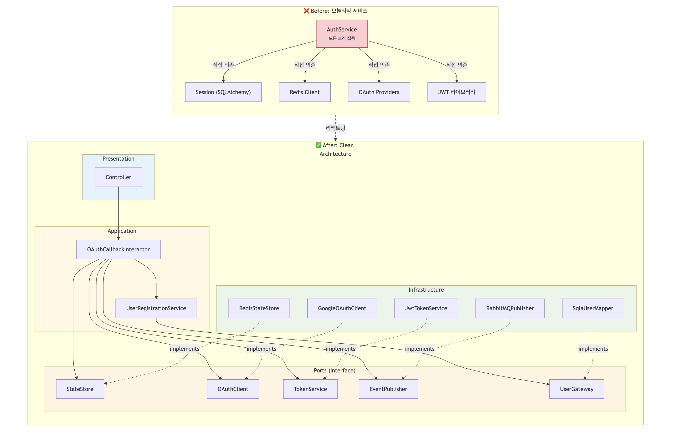 항목 Before After 효과 로그아웃 Redis 직접 저장 이벤트 발행 느슨한 결합, API 응답 시간 단축 토큰 검증 블랙리스트 확인 포함 ext-authz 위임 중복 제거, 단일 책임 DTO 위치 Port 파일 내 정의 dto/ 디렉토리 분리 책임 분리, 순환 참조 방지 TokenRevokedError Domain Layer Application Layer 올바른 계층 배치 사용자 등록 Interactor 내 구현 UserRegistrationService 분리 의존성 축소, 테스트 용이 로그인 감사 PostgreSQL 직접 저장 이벤트 발행 auth-worker가 비동기 처리 계층별 예외 배치