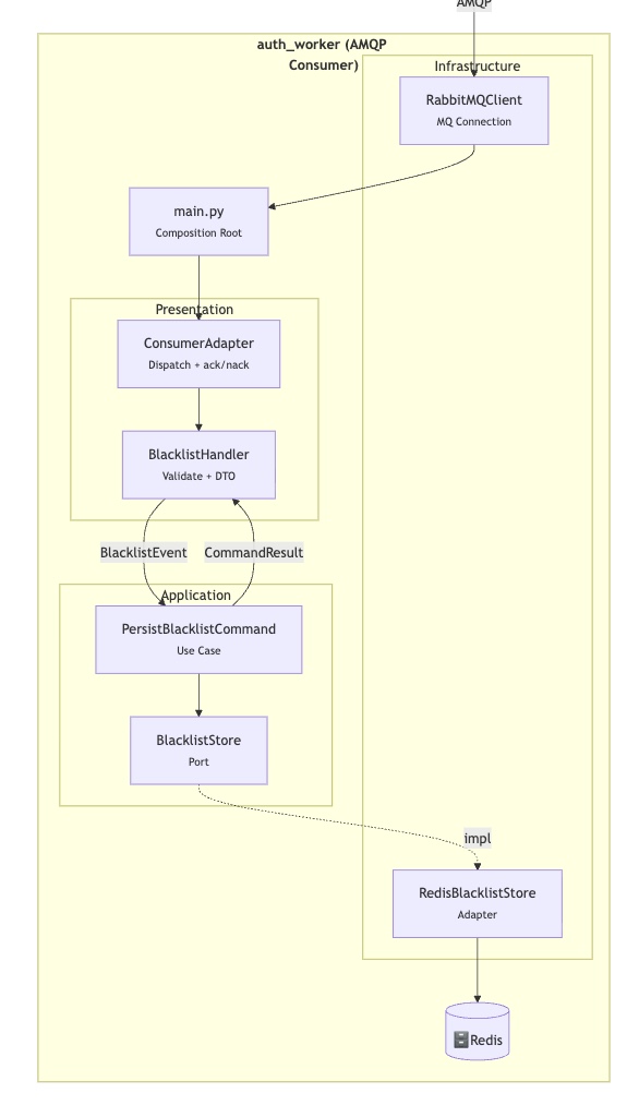 apps/auth_worker/ ├── main.py # Composition Root (DI만) ├── presentation/ # Inbound Adapter (AMQP) │ └── amqp/ │ ├── consumer.py # ConsumerAdapter (디스패칭 + ack/nack) │ ├── handlers/ │ │ ├── base.py # 검증 파이프라인 │ │ ├── blacklist.py # Handler → Command 호출 │ │ └── login_audit.py │ └── schemas.py # Pydantic 메시지 스키마 ├── application/ │ ├── commands/ │ │ ├── persist_blacklist.py # Use Case → CommandResult 반환 │ │ └── persist_login_audit.py │ └── common/ │ ├── result.py # CommandResult (SUCCESS/RETRYABLE/DROP) │ ├── dto/ │ └── ports/ # Port (primitive only) ├── infrastructure/ │ ├── messaging/ │ │ └── rabbitmq_client.py # MQ 연결/채널 (메시지 스트림) │ ├── persistence_postgres/ │ └── persistence_redis/ └── setup/ └── dependencies.py # DI 컨테이너계층별 책임 분리