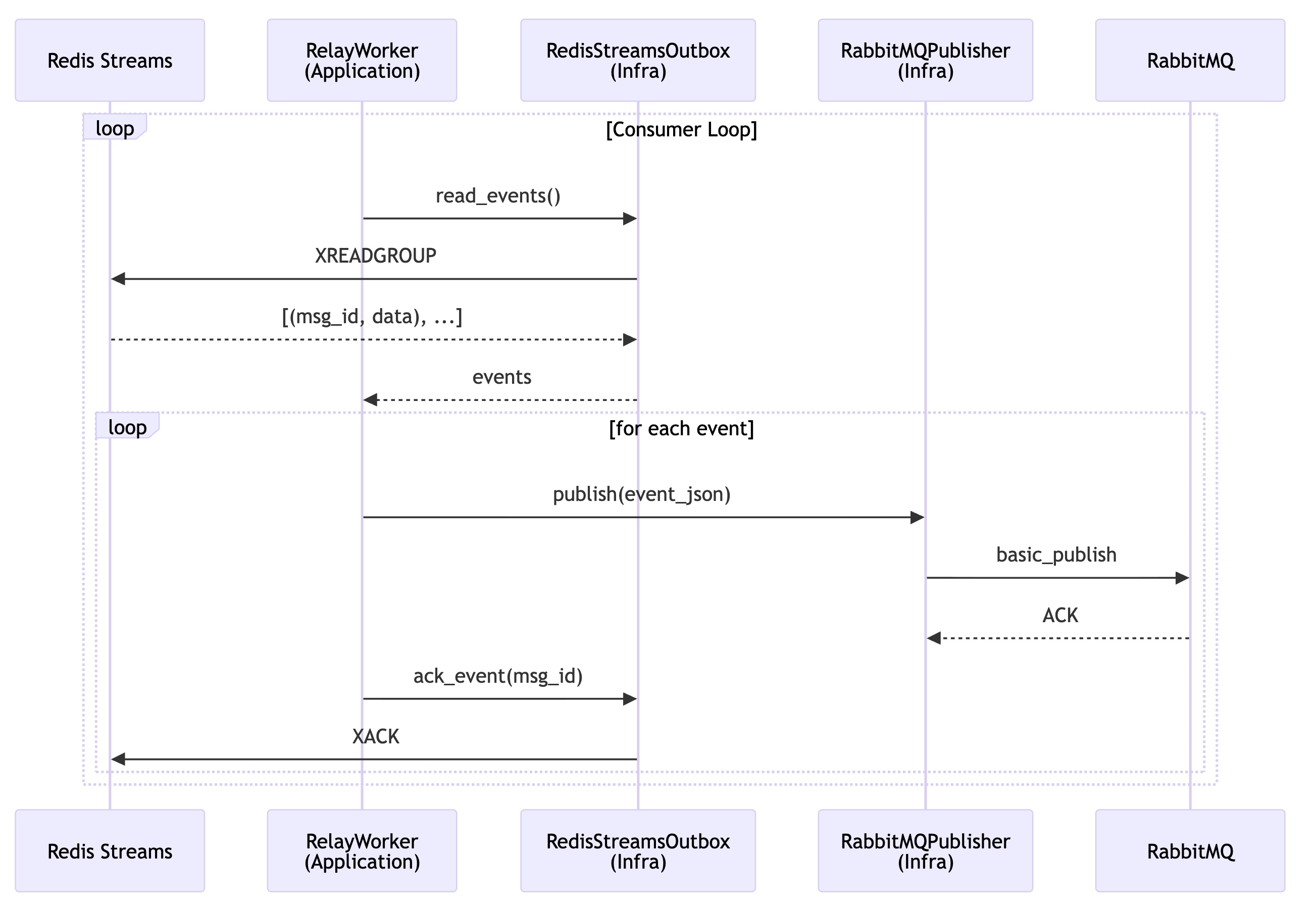 RelayWorker가XREADGROUP으로 새 메시지 읽기 (blocking)- 각 이벤트를 RabbitMQ로 발행 (