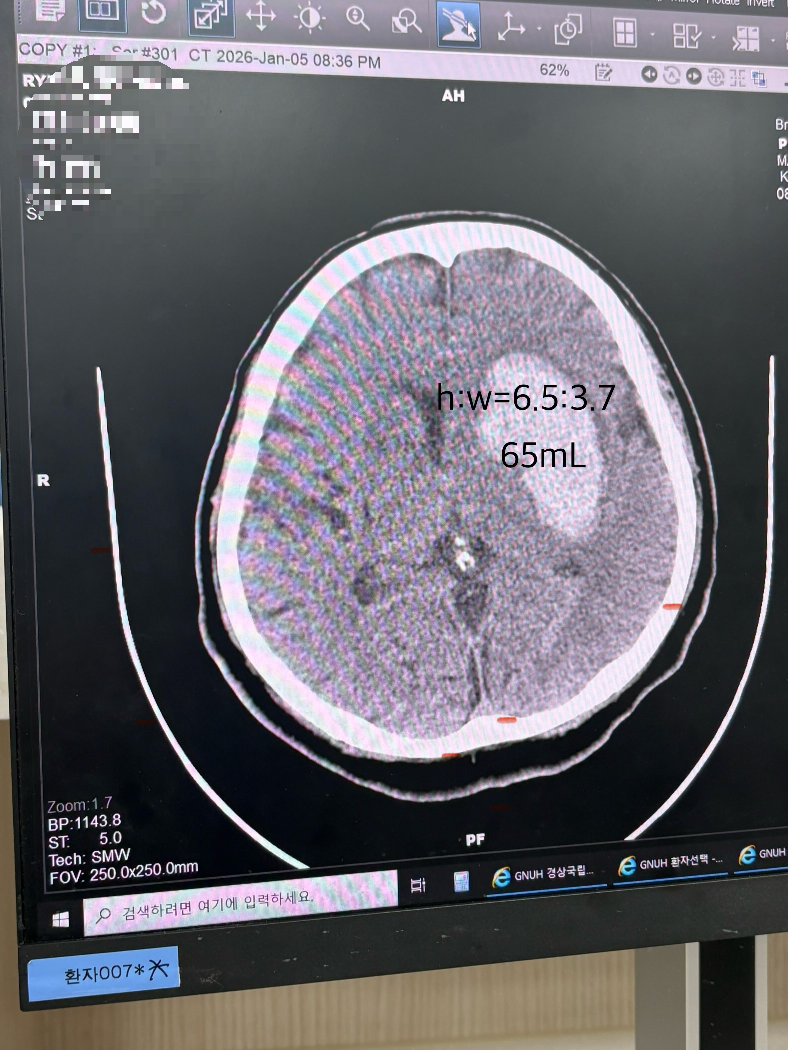 세로 6.5cm, 가로 3.7cm, 혈종 용적이 65mL로 운동 능력과 인지 일부, 시상 영역도 일부 포함됐다.