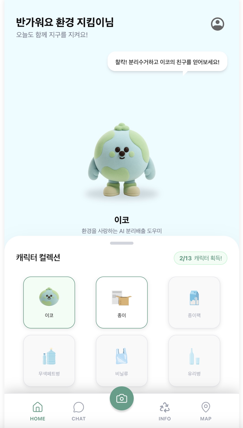 획득할 수 있는 캐릭터는 총 13종이다. 분리수거 누리집의 재활용품 카테고리 중 중분류를 기준으로 캐릭터와 매칭을 시켰다. (2레벨)