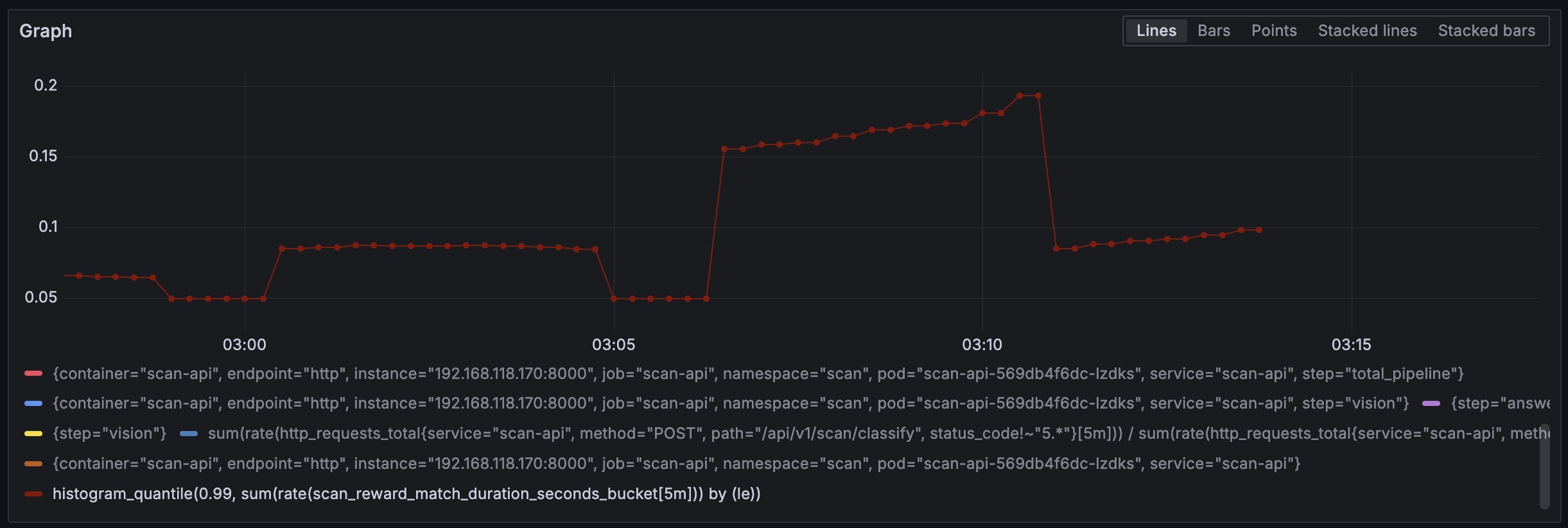 ScanService 내에서 asyncio.to_thread로 실행되는 AI 파이프라인을 논리적 단계(Step)로 분리하고, 각 구간별 실행 시간을 0.1초 단위로 측정하도록 커스텀 Histogram 메트릭(scan_pipeline_step_duration_seconds)을 도입했다.