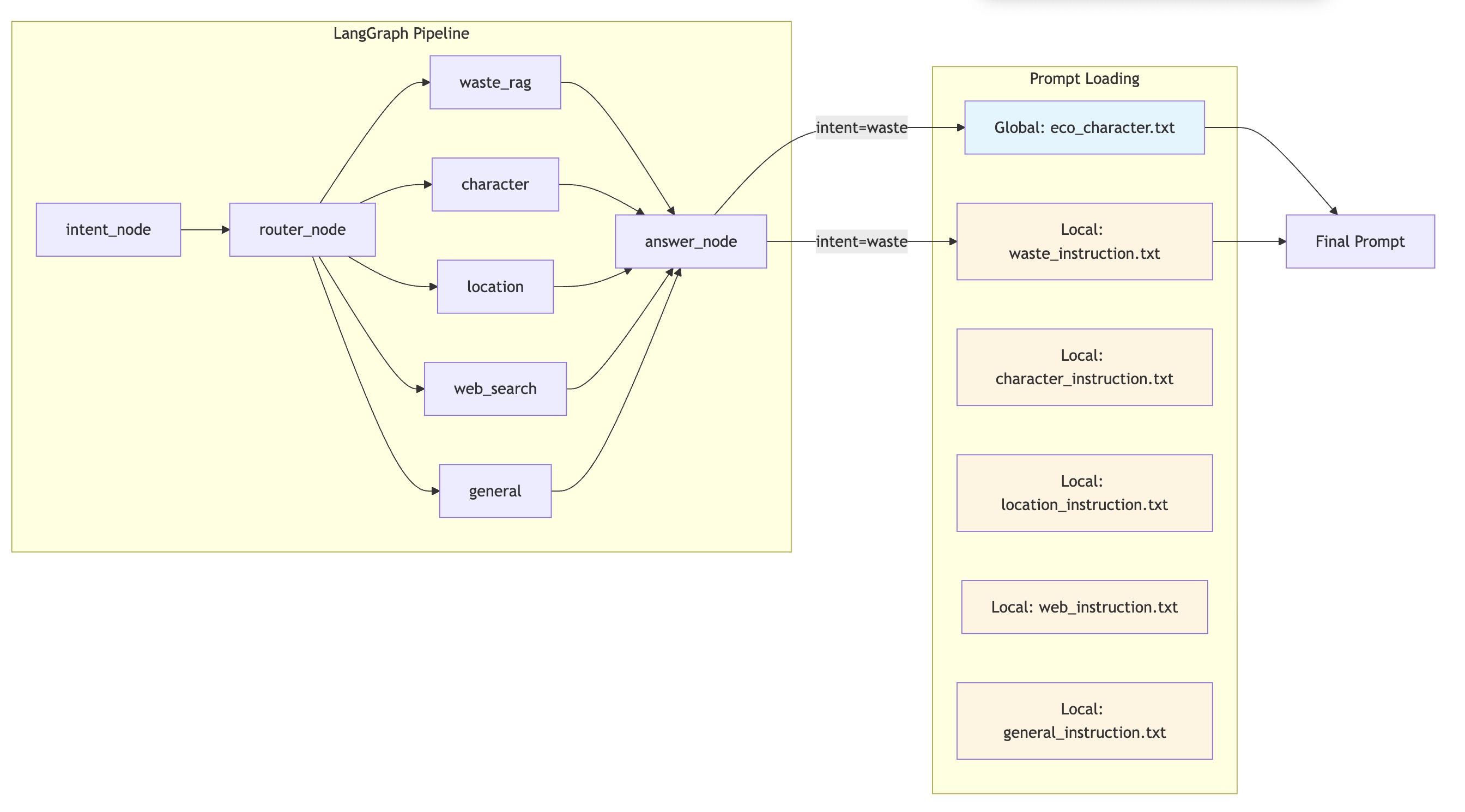 apps/chat_worker/infrastructure/assets/prompts/ ├── global/ # 캐릭터 정의 (모든 Intent 공통) │ └── eco_character.txt # "이코" 페르소나 ├── local/ # Intent별 Answer 지침 │ ├── waste_instruction.txt # 분리배출 답변 지침 │ ├── character_instruction.txt # 캐릭터 답변 지침 │ ├── location_instruction.txt # 위치 답변 지침 │ ├── web_instruction.txt # 웹 검색 답변 지침 │ └── general_instruction.txt # 일반 대화 지침 ├── classification/ # 분류 프롬프트 │ ├── intent.txt # Intent 분류 │ ├── text.txt # 텍스트 분류 │ └── vision.txt # Vision 분류 └── subagent/ # 서브에이전트 프롬프트 ├── character.txt └── location.txt2.2 프롬프트 흐름