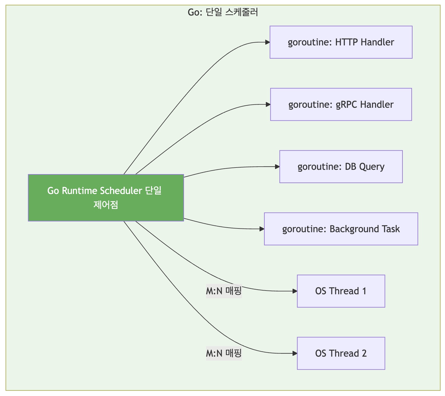 Go의 경우 Runtime Scheduler에서 goroutine을 병렬로 스케줄링 // Go Runtime이 모든 goroutine을 "알고 있음" // → 지능적인 스케줄링 가능 func httpHandler() { // I/O 대기 시 자동으로 다른 goroutine에게 양보 resp, _ := http.Get("...") // 여기서 스케줄러가 전환 결정 } func grpcHandler() { // 동일한 스케줄러가 관리 // → HTTP와 gRPC 간 공정한 CPU 배분 }