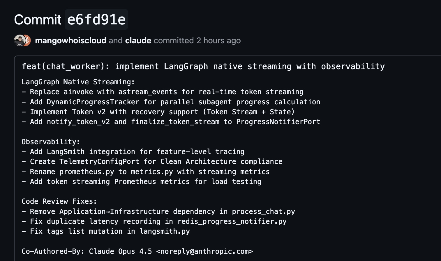 파일 변경 내용 application/ports/events/progress_notifier.pynotify_token_v2,finalize_token_stream추가application/ports/telemetry.py신규 - TelemetryConfigPort, NoOpTelemetryConfig application/services/progress_tracker.py신규 - DynamicProgressTracker, Phase 기반 Progress application/commands/process_chat.pyastream_events전환, Telemetry Port 주입infrastructure/events/redis_progress_notifier.pyToken Stream + State 구현 infrastructure/telemetry/langsmith_adapter.py신규 - LangSmithTelemetryAdapter infrastructure/orchestration/langgraph/nodes/answer_node.pynotify_token제거