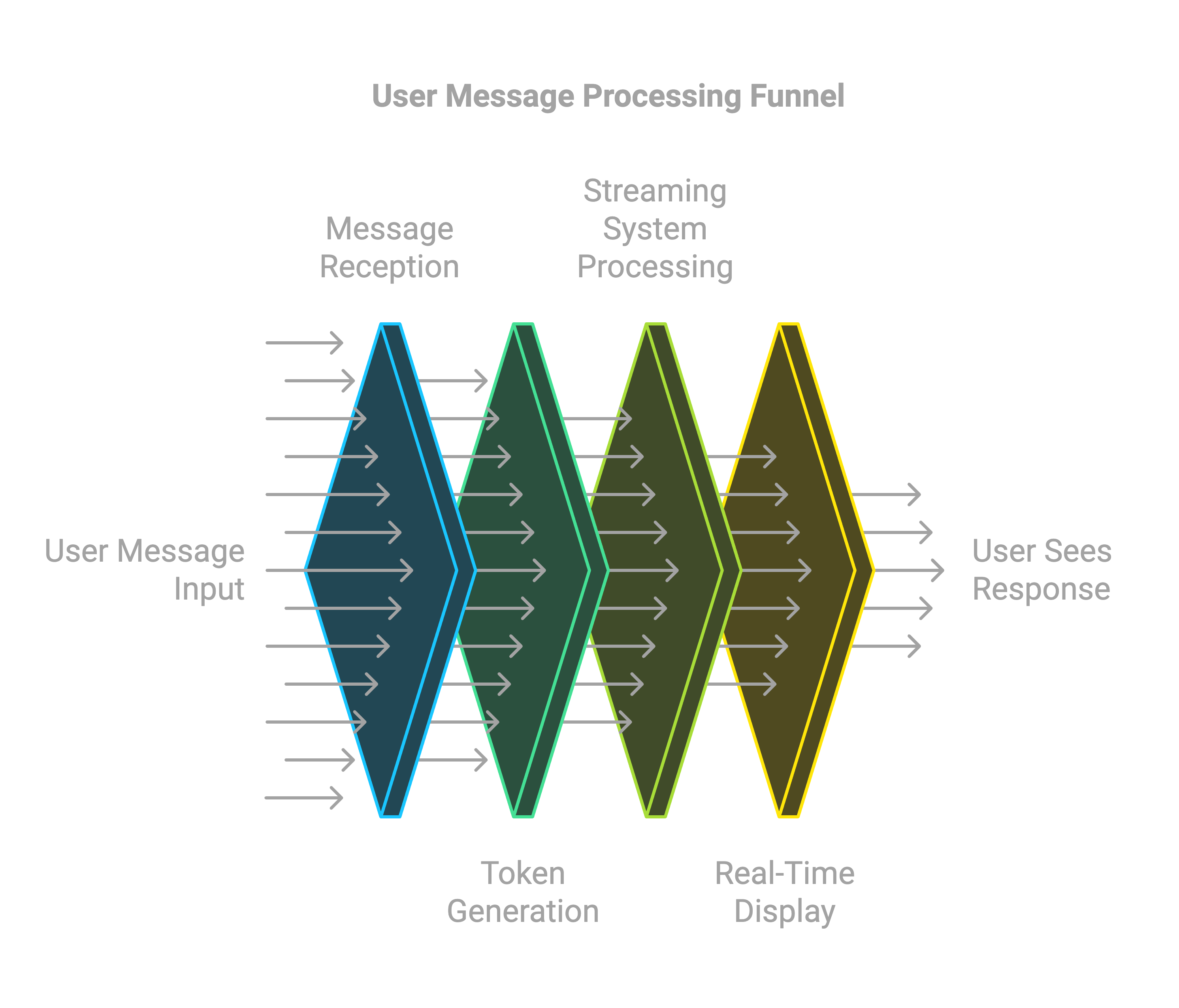 ┌─────────────────────────────────────────────────────────────────────────────┐ │ stream_mode="messages" 아키텍처 │ ├─────────────────────────────────────────────────────────────────────────────┤ │ │ │ ProcessChatCommand._execute_streaming() │ │ │ │ │ └── pipeline.astream(state, stream_mode=["messages", "updates"]) │ │ │ │ │ ├── messages → (AIMessageChunk, metadata) │ │ │ │ │ │ │ └── notify_token_v2(content=chunk.content) ✅ │ │ │ │ │ └── updates → {"node_name": state_update} │ │ │ │ │ └── notify_stage(stage=node_name, status=...) ✅ │ │ │ └─────────────────────────────────────────────────────────────────────────────┘