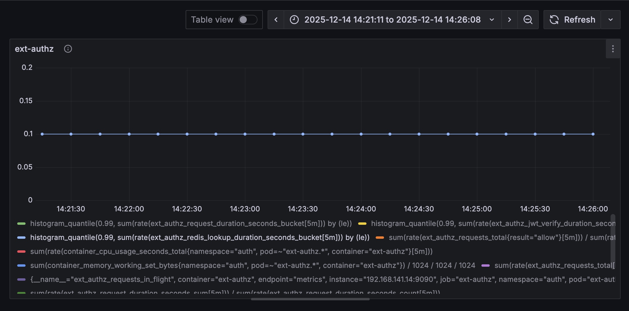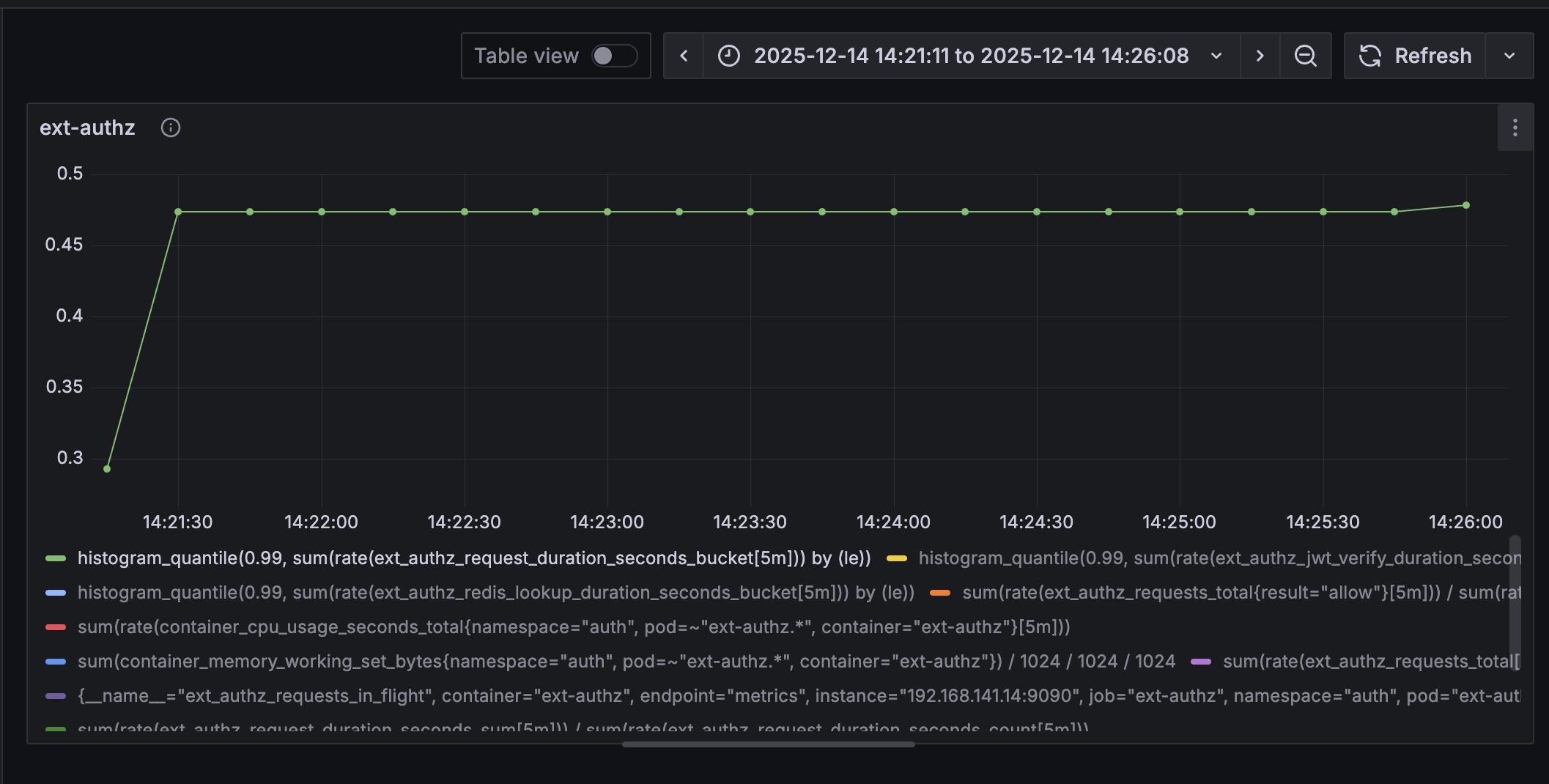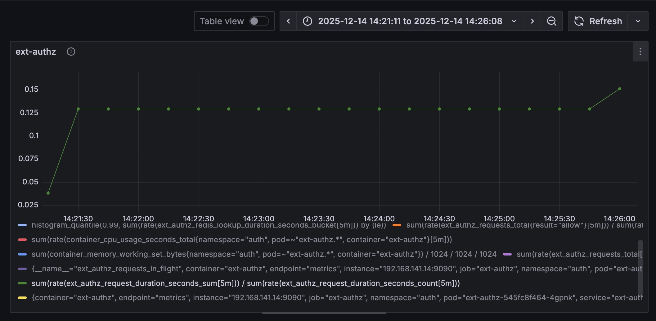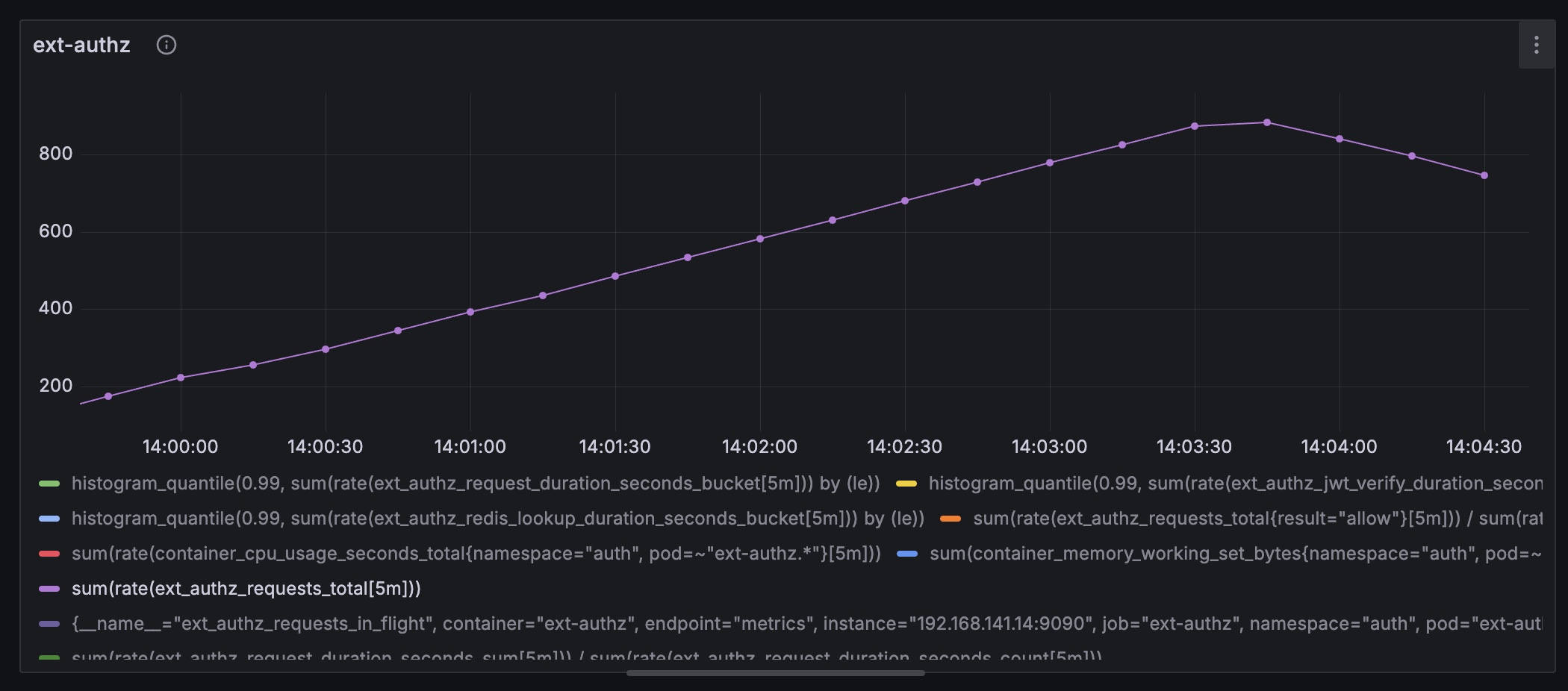 Locust의 RPS는 전체 플로우를 기준으로 잡히기에 보다 정밀한 측정을 위해 ext-authz의 RPS를 측정하는 쿼리를 추가했다.