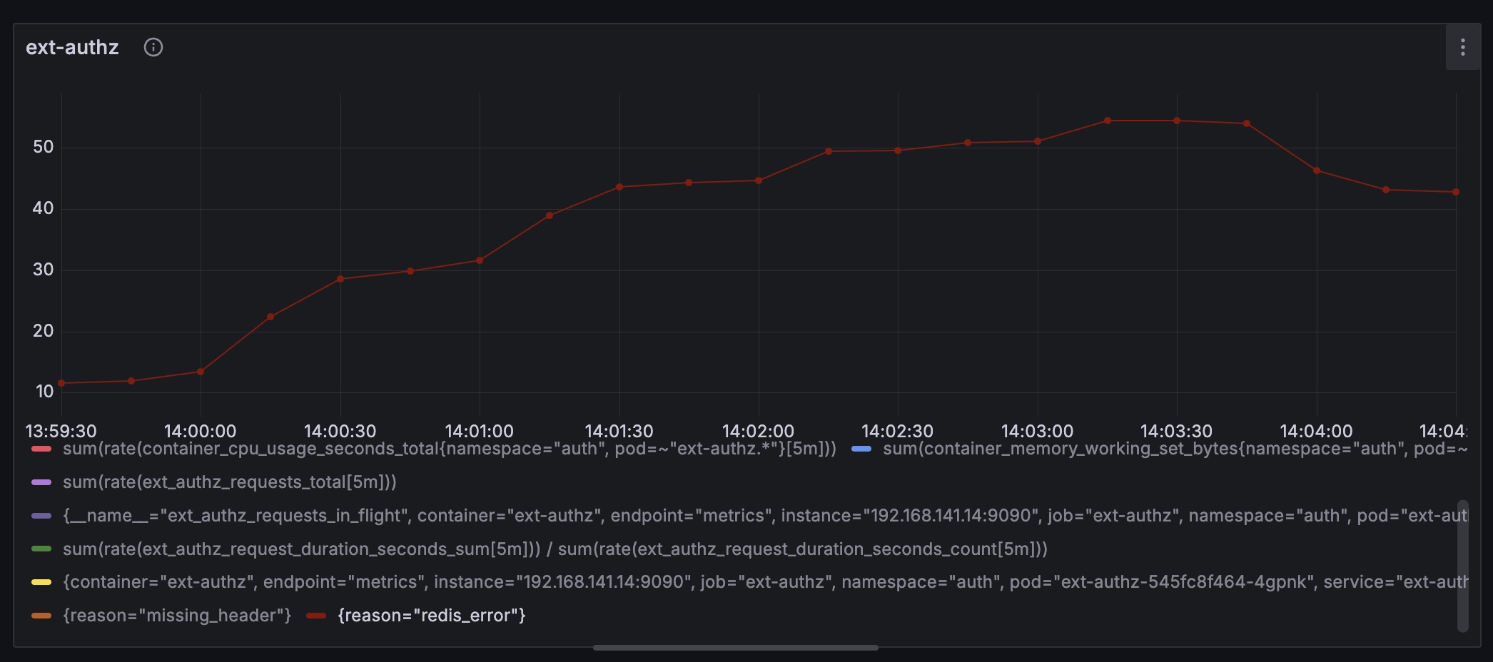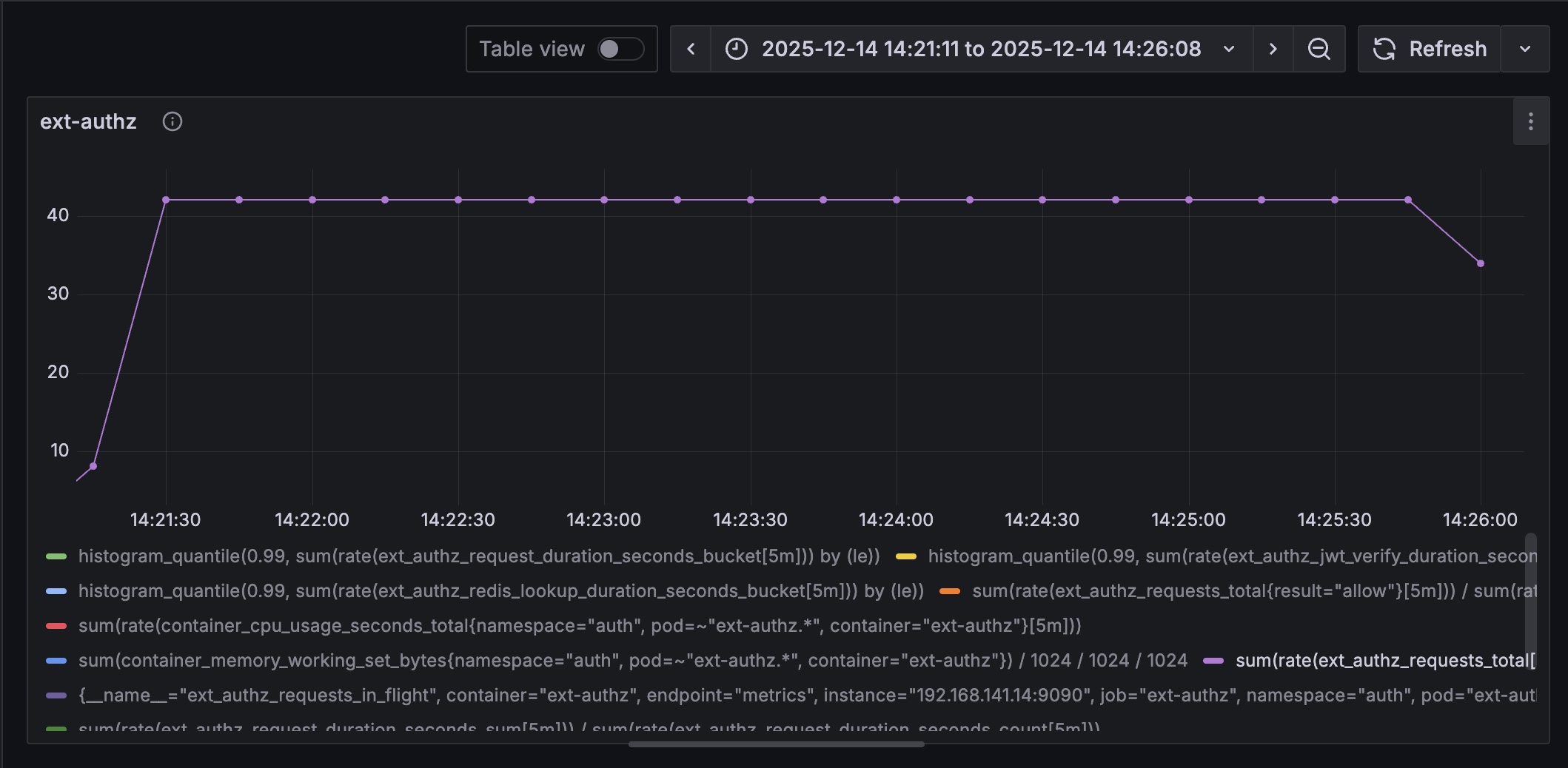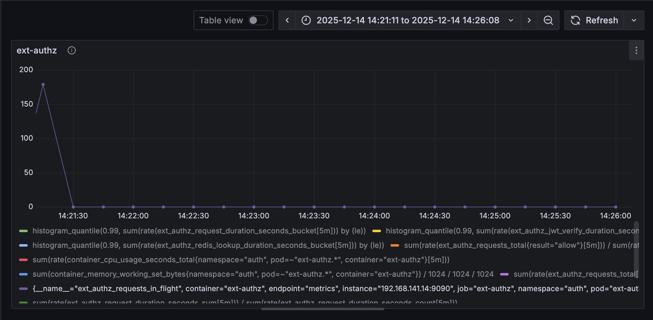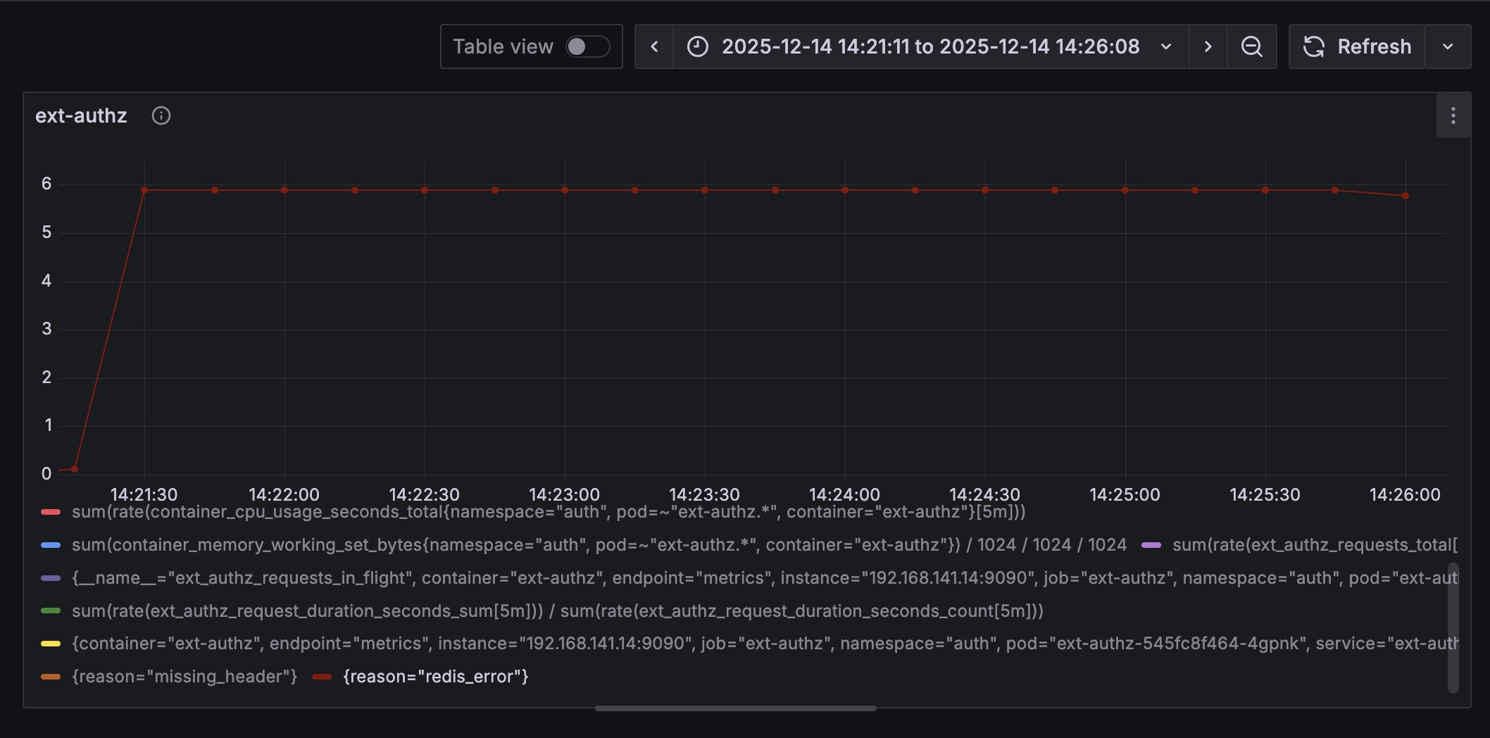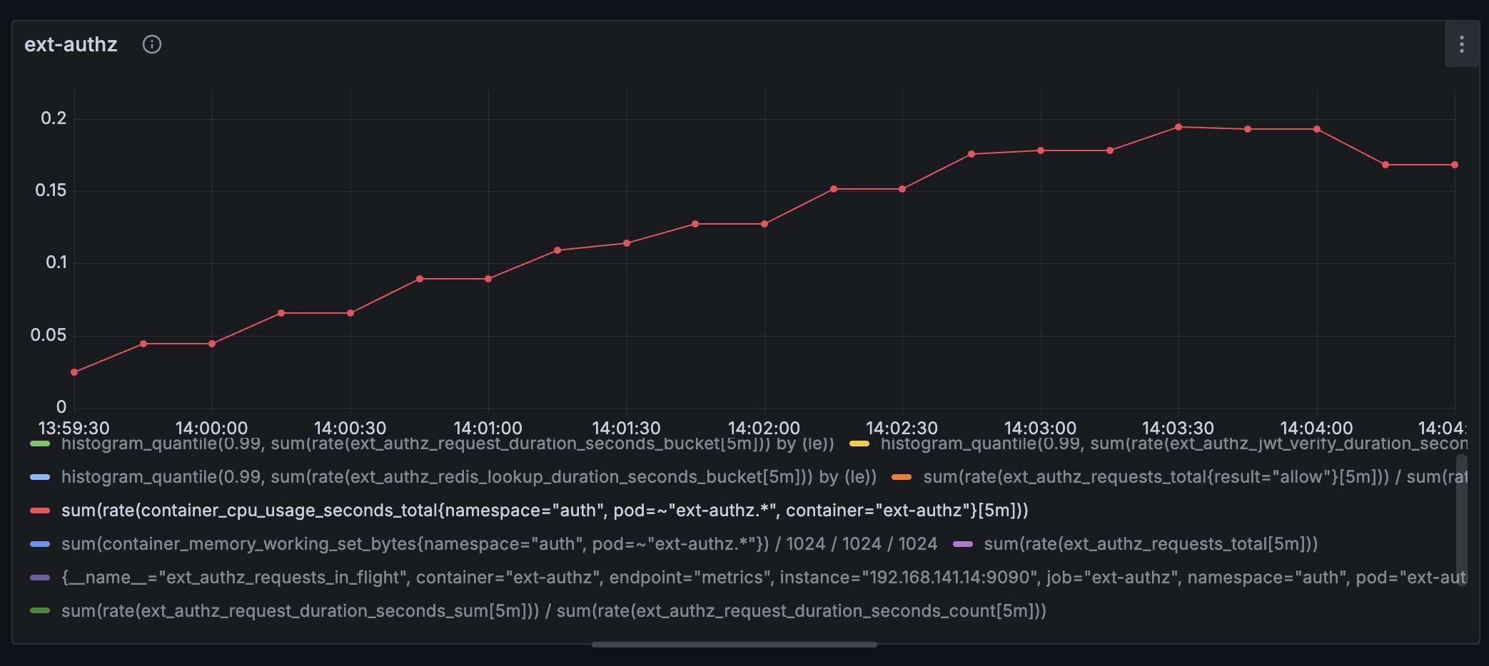 Locust의 RPS는 전체 플로우를 기준으로 잡히기에 보다 정밀한 측정을 위해 ext-authz의 RPS를 측정하는 쿼리를 추가했다.
