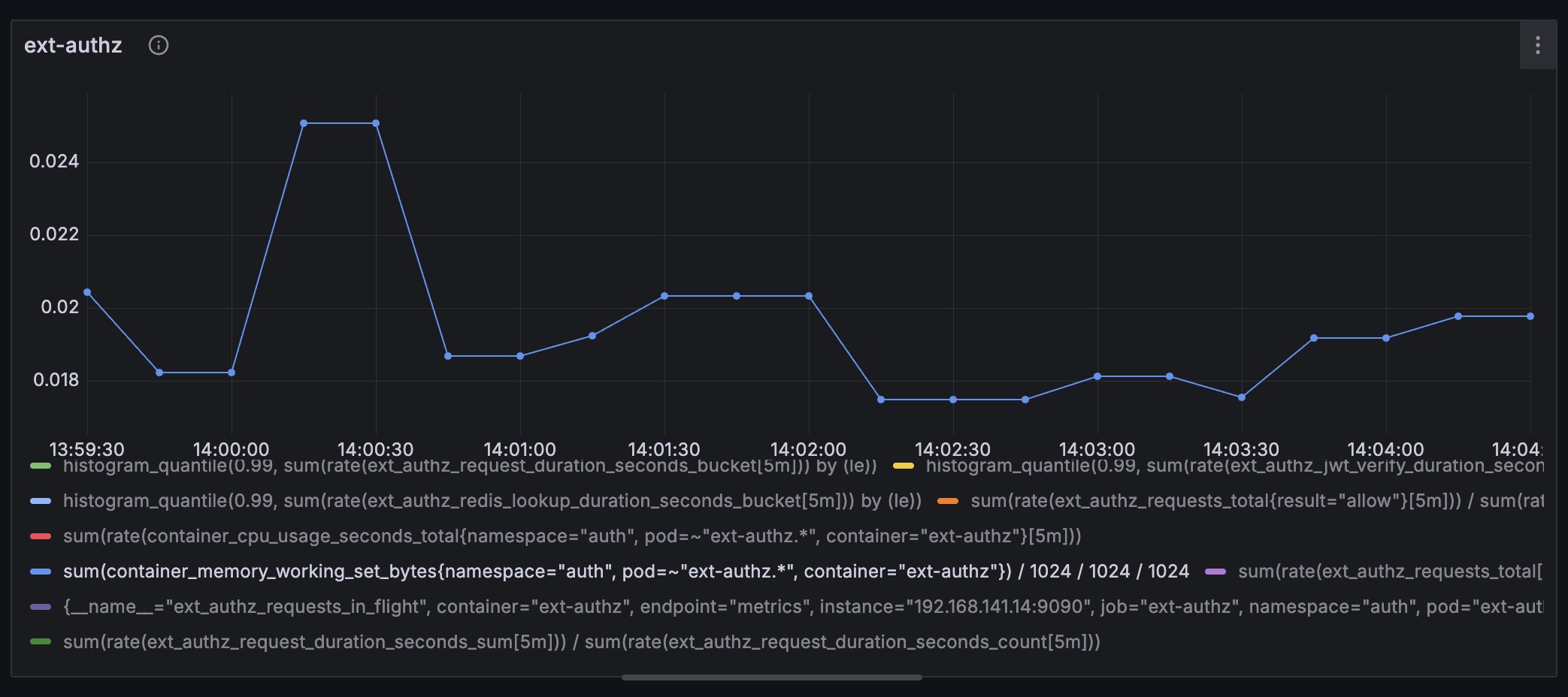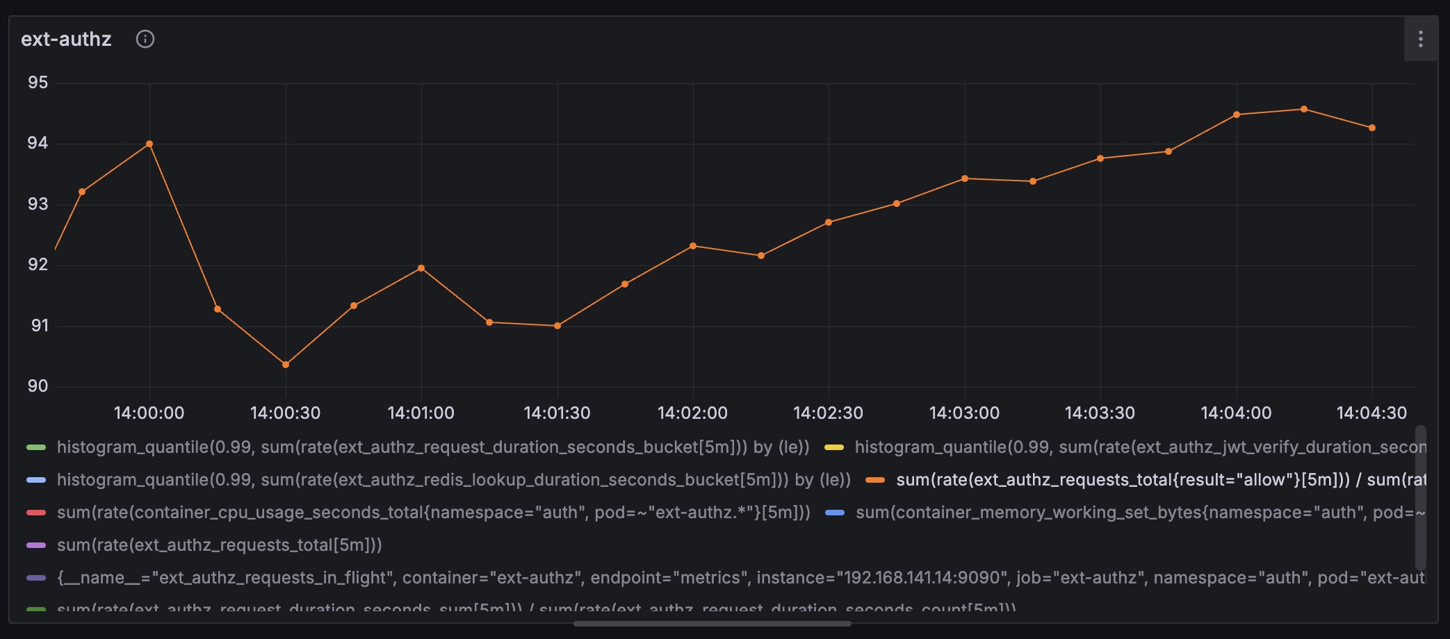 현재로선 ext-authz의 CPU limits와 Redis 커넥션 풀(PoolSize=20)이 주요 병목 지점이다.주요 지표 요약