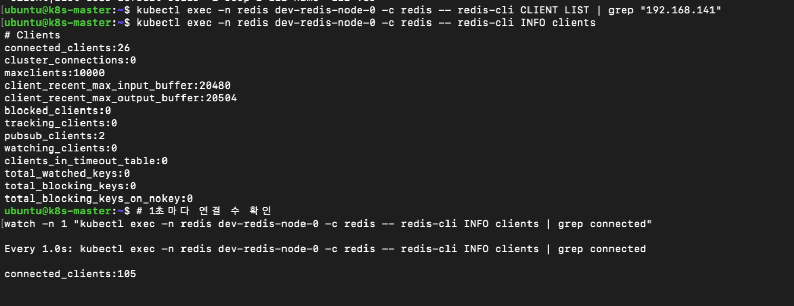 ubuntu@k8s-master:~$ watch -n 1 "kubectl exec -n redis dev-redis-node-0 -c redis -- redis-cli INFO clients | grep connected" Every 1.0s: kubectl exec -n redis dev-redis-node-0 -c redis -- redis-cli INFO clients | grep connected k8s-master: Mon Dec 15 13:18:05 2025 connected_clients:108 ubuntu@k8s-master:~$ watch -n 1 "kubectl exec -n redis dev-redis-node-0 -c redis -- redis-cli INFO clients | grep connected" Every 1.0s: kubectl exec -n redis dev-redis-node-0 -c redis -- redis-cli INFO clients | grep connected k8s-master: Mon Dec 15 15:00:52 2025 connected_clients:5494 # 좀비 커넥션이 쌓인 모습이다. RTT를 측정한 뒤, 그 값을 기준으로 connection TTL을 조정하자.https://snapshots.raintank.io/dashboard/snapshot/P5uoWRrXqFYBvoc9AvXP4kYF1M6jpfeG