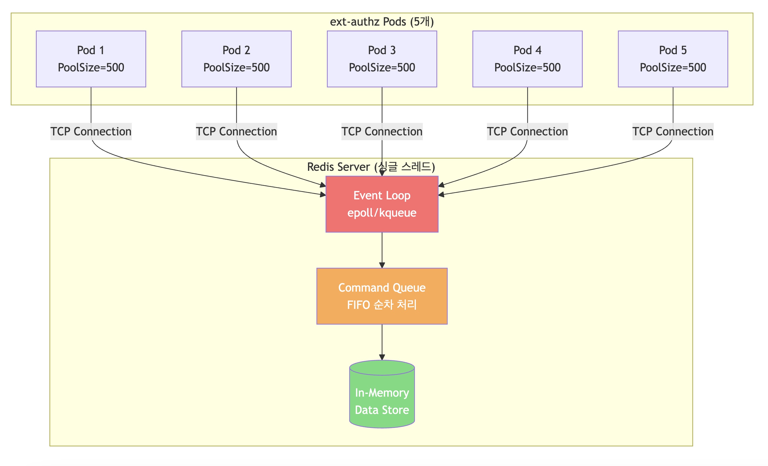 Redis 파드의 초기 커넥션 풀이 26에서 출발해 부하 환경에선 105까지 상승하는 걸 확인할 수 있다. 설정 기본값 튜닝값 환경변수 PoolSize 20 100 REDIS_POOL_SIZEMinIdleConns 0 20 REDIS_MIN_IDLE_CONNSPoolTimeout 4s 2s REDIS_POOL_TIMEOUT_MSReadTimeout 3s 1s REDIS_READ_TIMEOUT_MSWriteTimeout 3s 1s REDIS_WRITE_TIMEOUT_MS앞서 밝혔듯 k8s-redis 노드의 스펙은 여유로운 상황이고 Redis의 Pod 레벨 HA, 도메인과 Redis 간 노드 격리 또한 보장된 상황이다. Redis PoolSize를 Idle: 10->20, Max: 20->100까지 올려, ext-authz의 성능 지표가 개선되는지부터 확인했다.
