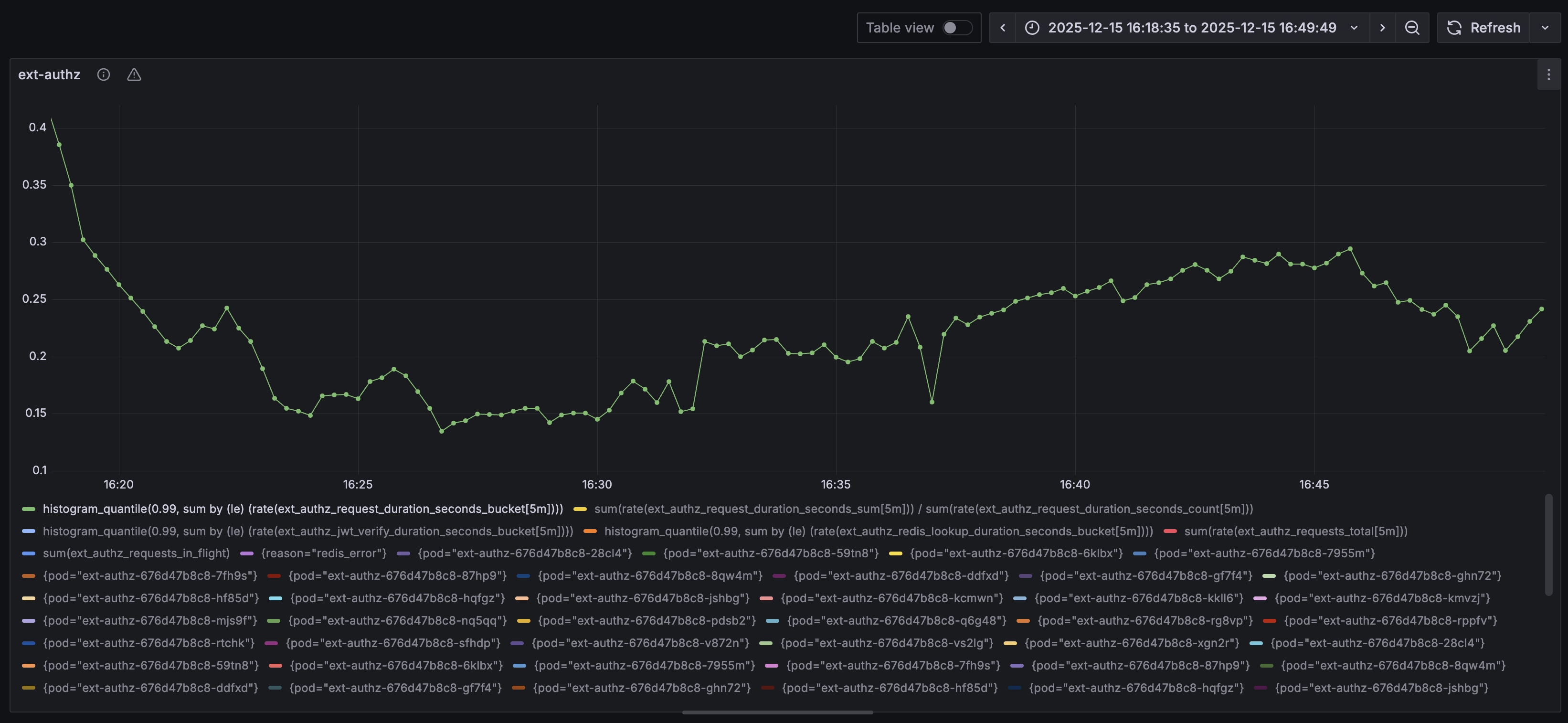대시보드 스냅샷을 살펴보면 확인할 수 있지만 측정된 메트릭 수치가 동일해서 redis lookup의 병목이 그대로 latency가 된다. ext-authz가 클러스터 내에서 가장 성능이 빠르긴 하지만..