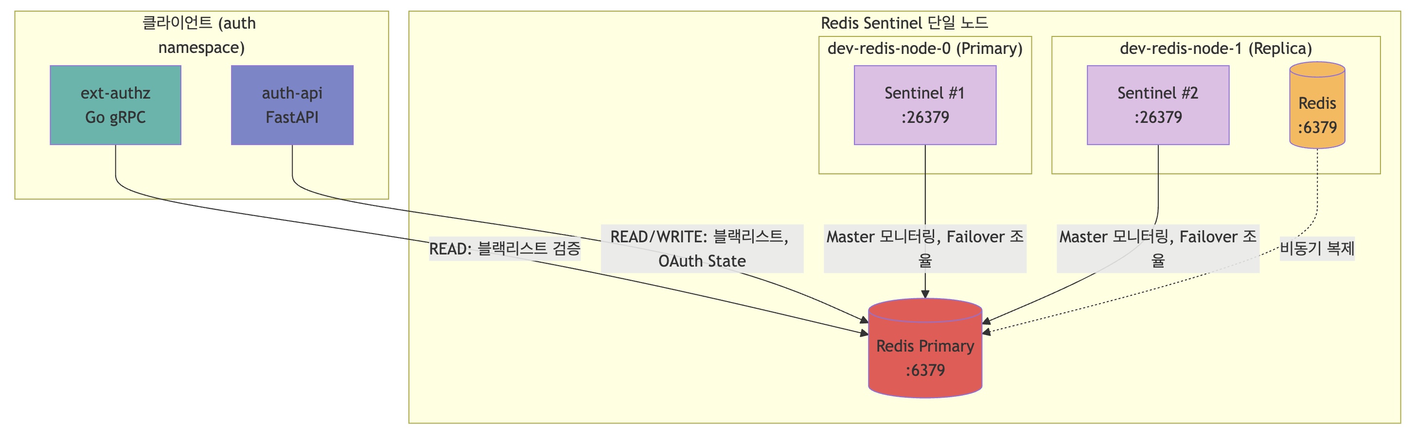 ubuntu@k8s-master:~$ kubectl get pods -n redis -o wide NAME READY STATUS RESTARTS AGE IP NODE NOMINATED NODE READINESS GATES dev-redis-node-0 3/3 Running 0 4d22h 192.168.37.134 k8s-redis <none> <none> dev-redis-node-1 3/3 Running 0 4d22h 192.168.37.135 k8s-redis <none> <none> ubuntu@k8s-master:~$ kubectl describe nodes k8s-redis ... Addresses: InternalIP: 10.0.2.235 Hostname: k8s-redis Capacity: cpu: 2 ephemeral-storage: 30297152Ki hugepages-1Gi: 0 hugepages-2Mi: 0 memory: 3928856Ki pods: 110 ... Allocated resources: (Total limits may be over 100 percent, i.e., overcommitted.) Resource Requests Limits -------- -------- ------ cpu 1080m (54%) 5300m (265%) memory 1656Mi (44%) 5248Mi (140%) ephemeral-storage 100Mi (0%) 4Gi (15%) hugepages-1Gi 0 (0%) 0 (0%) hugepages-2Mi 0 (0%) 0 (0%) Events: <none>소스 연결 수 용도 Redis 연산 ext-authz (Go) 10 JWT 블랙리스트 조회 EXISTS blacklist:{jti}auth-api (FastAPI) ~1 블랙리스트 등록/삭제 SET,DELSentinel (HA) 4 Primary 감시 (2노드 × 2연결) PING,SUBSCRIBEReplica 1 데이터 동기화 (node-1 → node-0) REPLCONF합계 26 현재 이코에코는 Redis Sentinel로 구성되어 있다.