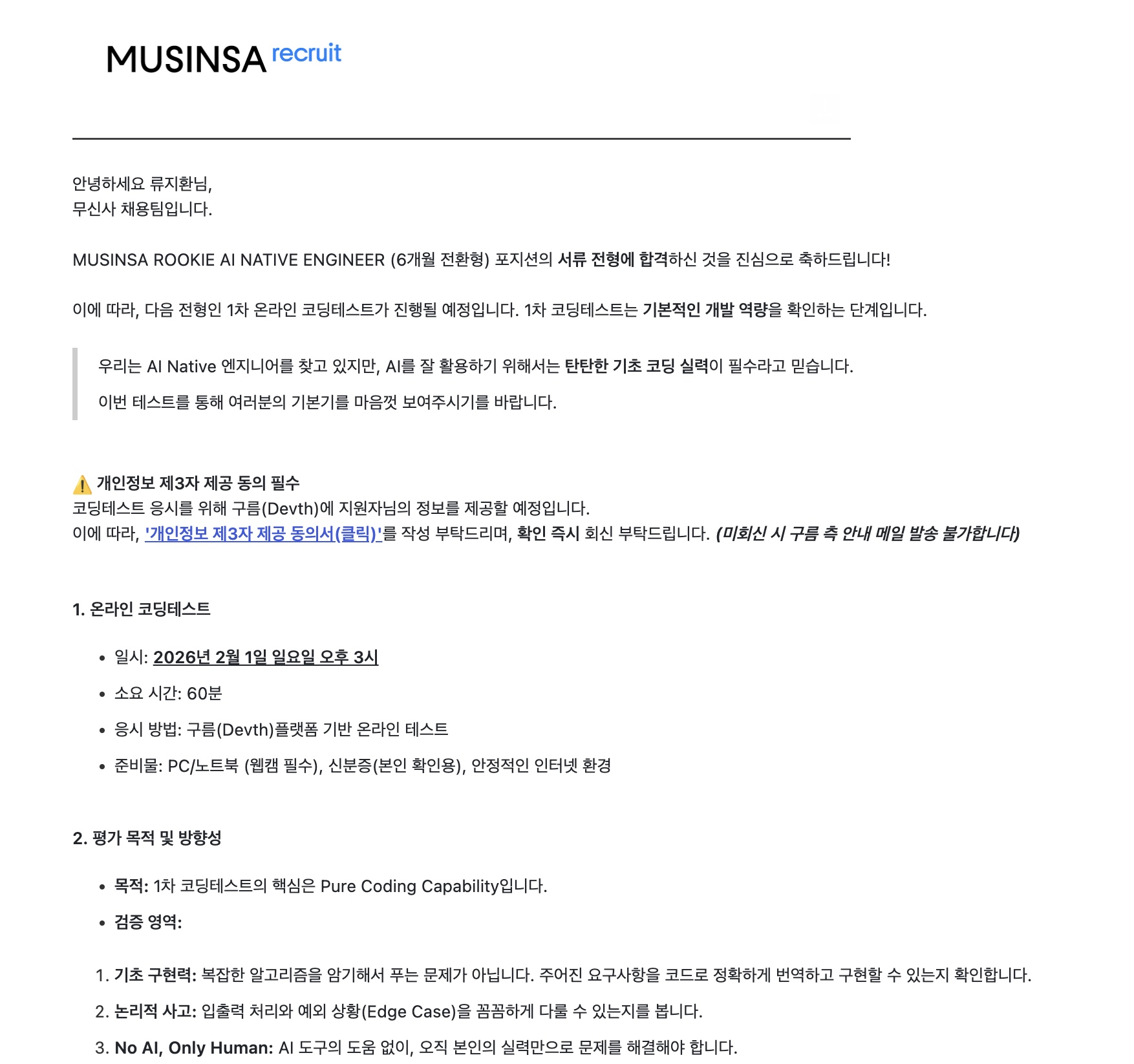 무신사 AI Native Engineer 공고 서류 합격 메일을 받았다. 수상 이후로 빗썸, 에이블리 등 2-5곳에 해당하는 IT 기업에 지원했지만 모두 서류 탈락을 한 뒤, 무거운 마음으로 개발과 고도화를 이어가고 있었다. 아버지께서 쓰러진 이후 청구된 병원비와 차후 투입될 재활 비용을 듣고 나선, 개발 비용을 과도하게 쓴 것에 대한 후회랑 죄책감도 남아있었기에 한동안 비관적으로 에이전트 개발에 임했다. 그런 와중 받은 무신사 서류 합격 소식이라 정말 기뻤다. 전직장을 다니면서 이커머스의 성장 한계치가 높다는 건 익히 느끼고 있어서 무신사는 꽤 좋게 생각하던 기업이었다. 요즘 같은 시기에 개발자를 꾸준히 모으는 IT 기업은 네이버, 쿠팡, 토스, 무신사를 제외하면 몇 없기도 하고 말이다.