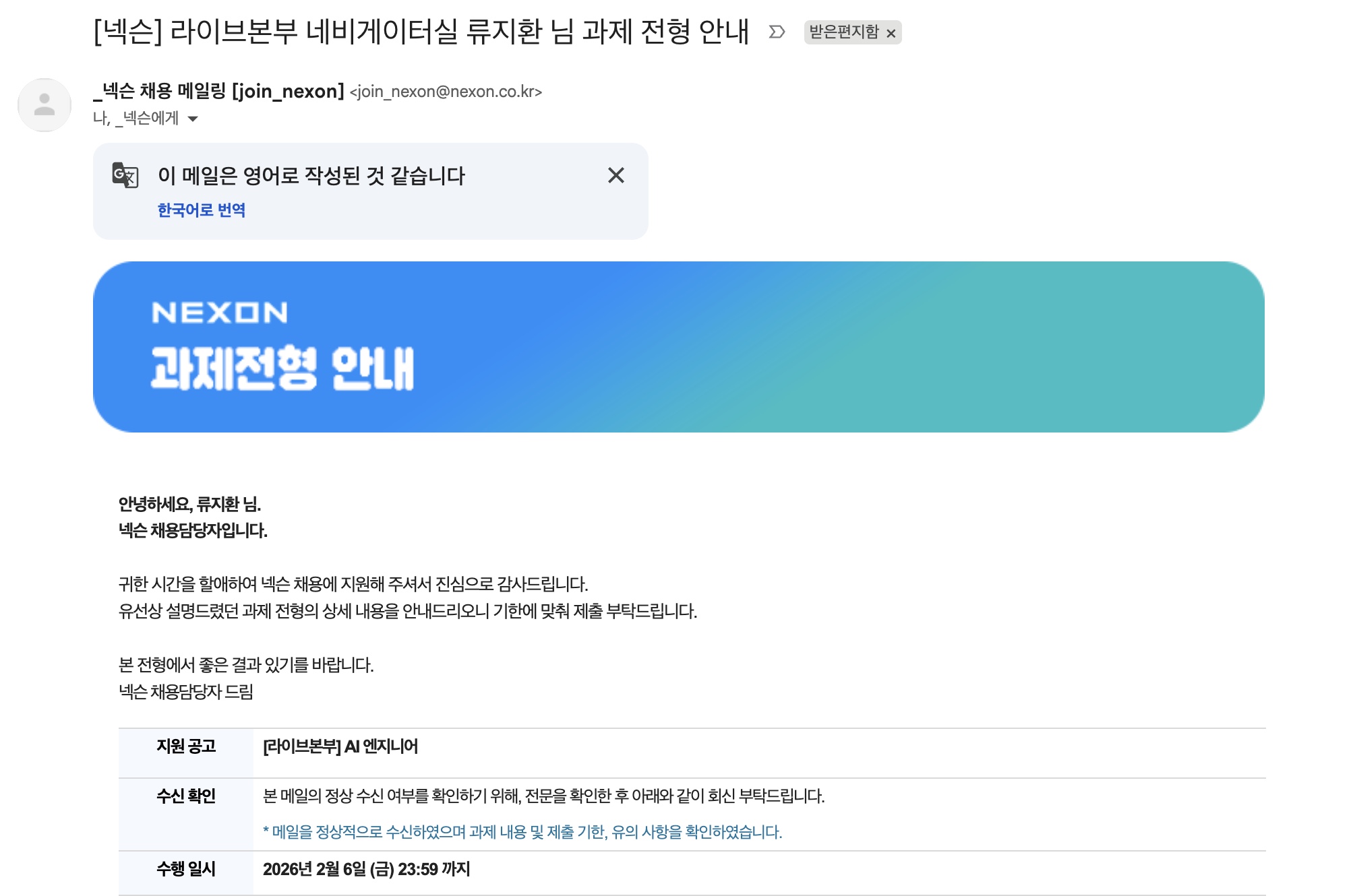 오늘 넥슨 라이브본부 네비게이터실로부터 AI 엔지니어 포지션 서류 합격 연락을 받았다.