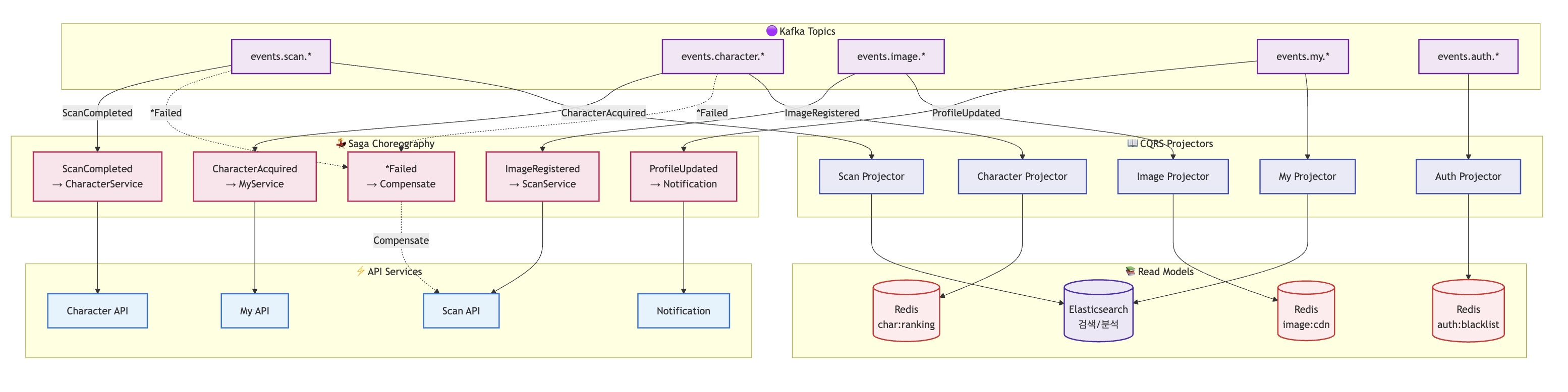 [Scan Pipeline Event Chain] 1. ScanClassified → Scan Projector (ES 인덱싱) 2. ScanAnswered → Scan Projector (ES 인덱싱) 3. RewardGranted → Character 서비스 (캐릭터 발급) 4. CharacterAcquired → My 서비스 (프로필 업데이트) 5. ProfileUpdated → Notification (푸시 알림) [Chat Pipeline Event Chain] 1. ChatClassified → Chat Projector (ES 인덱싱) 2. ChatAnswered → Chat Projector (대화 이력 저장)AI Pipeline의 각 단계에서 발생하는 이벤트가 독립적으로 처리되며, RewardGranted 이벤트만 Saga를 트리거하여 다음 도메인으로 전파된다. 서비스 간 직접적인 결합(Coupling)을 제거하여 독립적인 배포와 확장이 가능해진다.