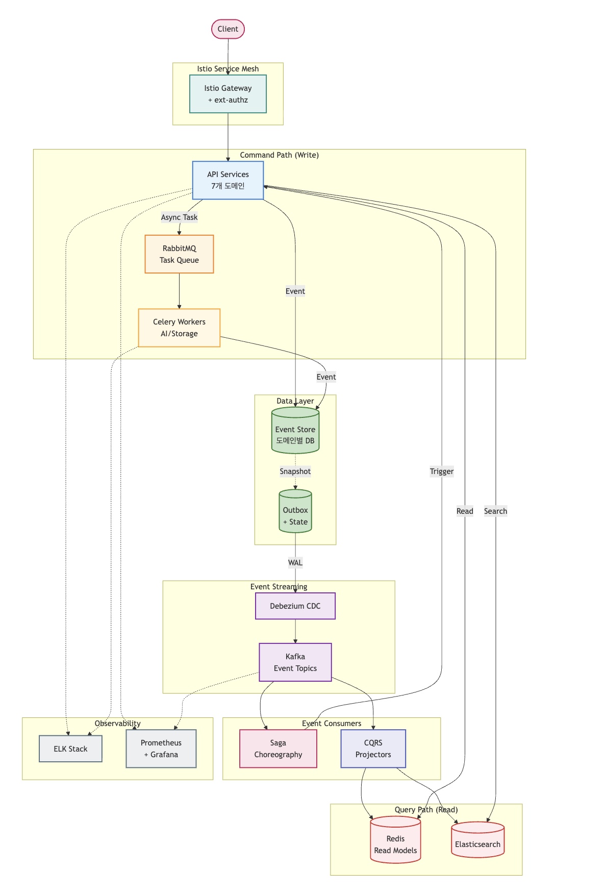 Event Store에 저장하여 데이터의 완전성을 보장한다. (Audit Log 역할 포함) - CQRS: 명령(Write)과 조회(Read) 모델을 분리한다.