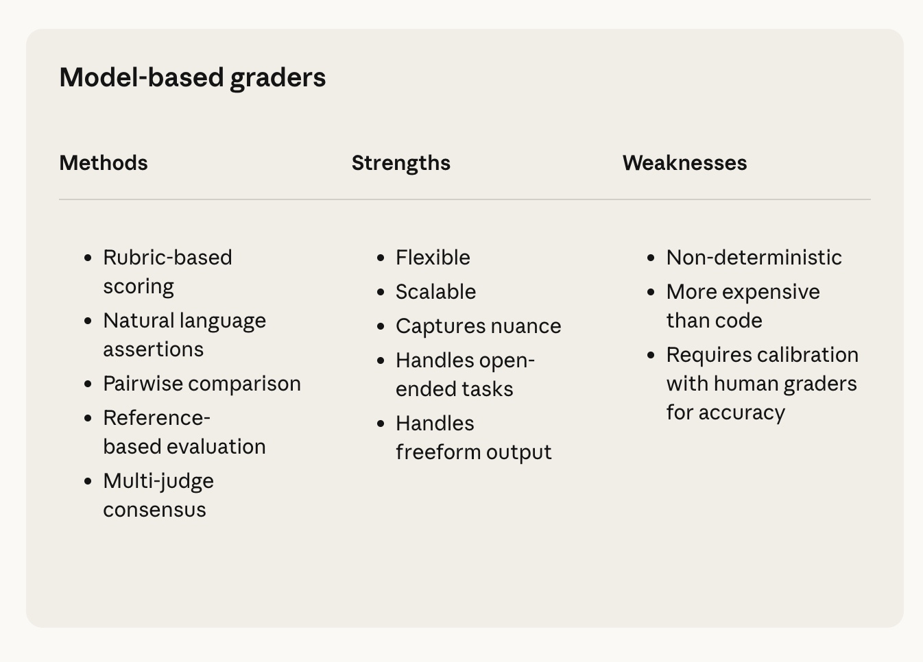 ┌───────────────────────────────────────────────────────┐ │ Layer 1: Code-Based Graders (결정적, 재현 가능) │ │ → 정량 임계치가 존재하는 축 │ │ → 구멍: 정성적 판단 불가 │ ├───────────────────────────────────────────────────────┤ │ Layer 2: LLM-Based Graders (확률적, 유연) │ │ → 정성적 판단이 필요한 축 │ │ → 구멍: 중심 편향, Hallucination │ ├───────────────────────────────────────────────────────┤ │ Layer 3: Human Graders (비용 높음, 최종 검증) │ │ → 전문가 패널 │ │ → 구멍: 확장성 한계, Criteria Drift │ └───────────────────────────────────────────────────────┘핵심 설계 원칙: