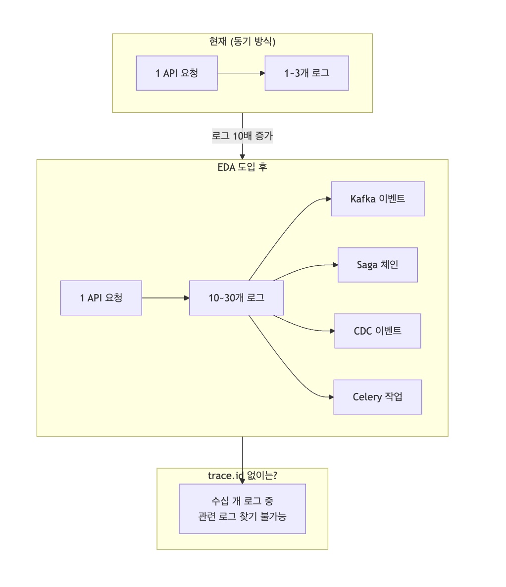현재: 1 요청 → 1~3개 로그 (일일 ~30,000 로그) EDA 후: 1 요청 → 10~30개 로그 (일일 ~300,000 로그)- Istio가 생성한 trace.id를 전체 흐름에서 공유