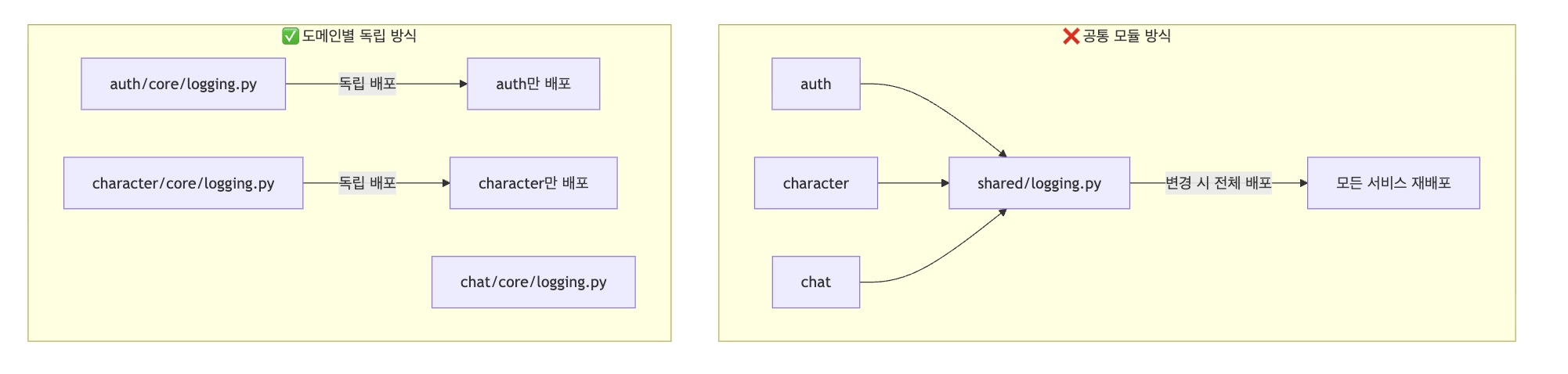 - 공통 모듈 의존 시 버전 충돌, 배포 동기화 문제 발생