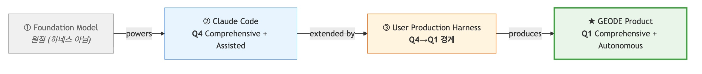 - Producer-Product Inversion이 관측됩니다. Assisted(Q4) 도구로 Autonomous(Q1)를 만드는 구조에서, ③(User Production Harness)이 변환 레이어로 기능하고 있습니다.