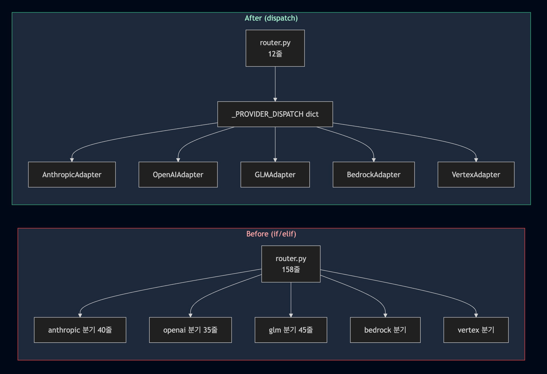 # core/llm/router.py — Phase 2 후 _PROVIDER_DISPATCH: dict[str, type[BaseProviderAdapter]] = { "anthropic": AnthropicAdapter, "openai": OpenAIAdapter, "glm": GLMAdapter, "bedrock": BedrockAdapter, "vertex": VertexAdapter, } async def call_llm_with_tools( self, messages: list[dict], tools: list[dict], model: str, provider: str, **kwargs: object, ) -> LLMResponse: adapter_cls = _PROVIDER_DISPATCH.get(provider) if adapter_cls is None: raise ValueError(f"Unknown provider: {provider}") adapter = adapter_cls(self._config) return await adapter.call(messages, tools, model, **kwargs)_PROVIDER_DISPATCH는 모듈 레벨 상수입니다. 새 Provider를 추가할 때는 딕셔너리에 1줄을 추가하고 BaseProviderAdapter를 구현하면 됩니다. call_llm_with_tools는 건드리지 않습니다.