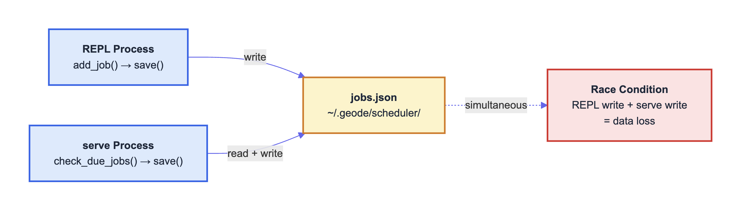 /schedule add로 새 잡을 추가합니다.save()가 jobs.json을 쓰기 시작합니다. - 거의 동시에 serve의 스케줄러 틱이 발생합니다.