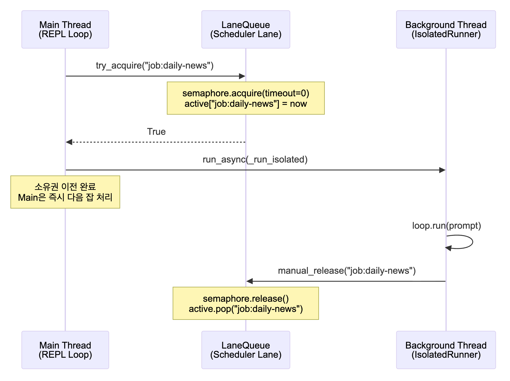 with lane.acquire("key"):블록 안에서 작업을 수행하면, 블록을 나올 때 자동으로 해제됩니다.# 동기: acquire와 release가 같은 스레드, 같은 스코프 with lane.acquire("job:daily-news"): result = loop.run(prompt) # 이 스레드에서 완료될 때까지 대기 # ← 자동 release하지만 스케줄러의 비동기 패턴에서는 이렇게 쓸 수 없습니다.