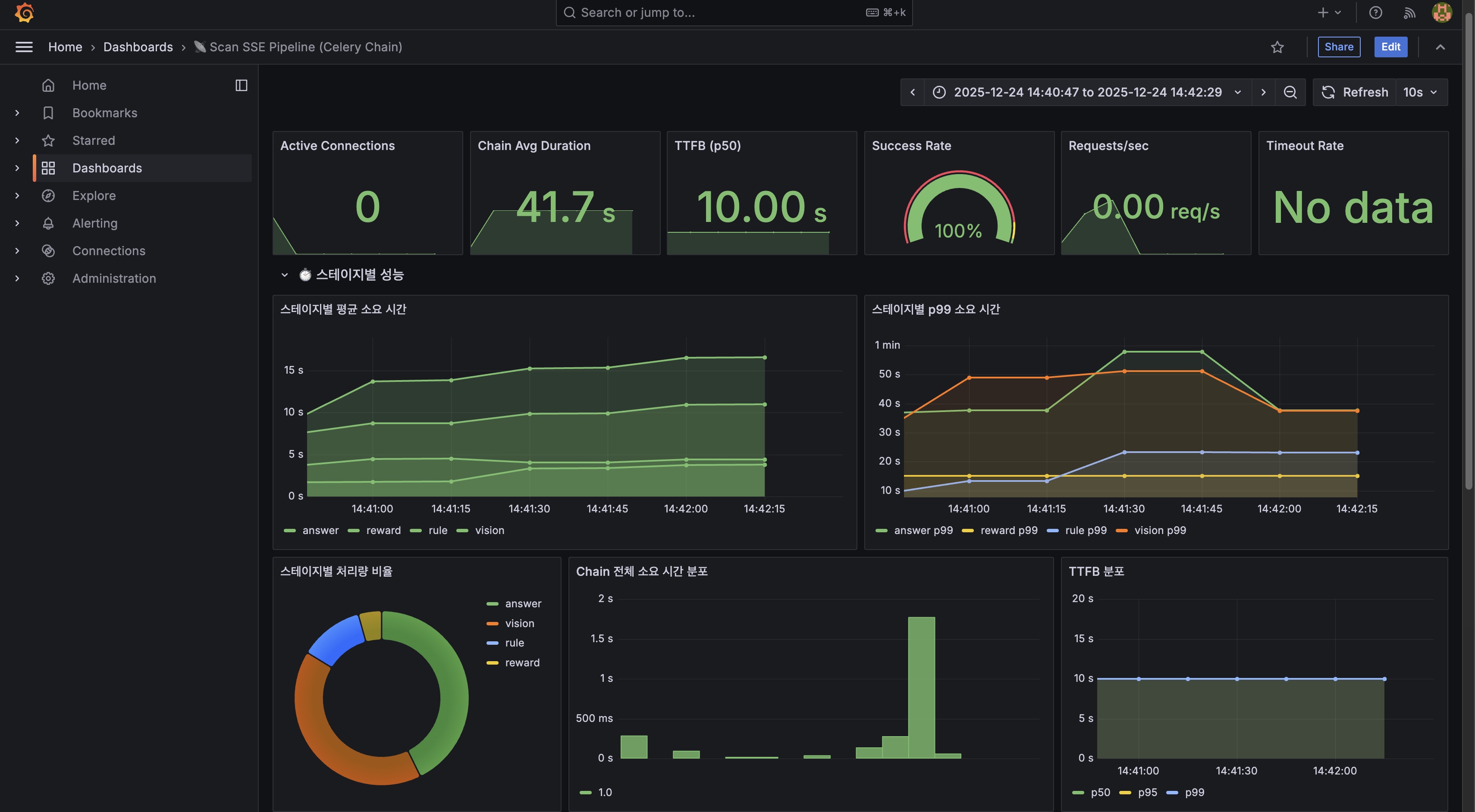 Chain Avg Duration 41.65초 전체 파이프라인 평균 TTFB (p50) 10.00초 첫 SSE 이벤트까지 TTFB (p99) 10.00초 tail latency 안정적 Requests/sec 0.0323 req/s 1시간 평균 RPM 1.94 RPM 분당 요청 Success Rate 100% 126/126 성공 Active Connections 0 측정 시점 유휴