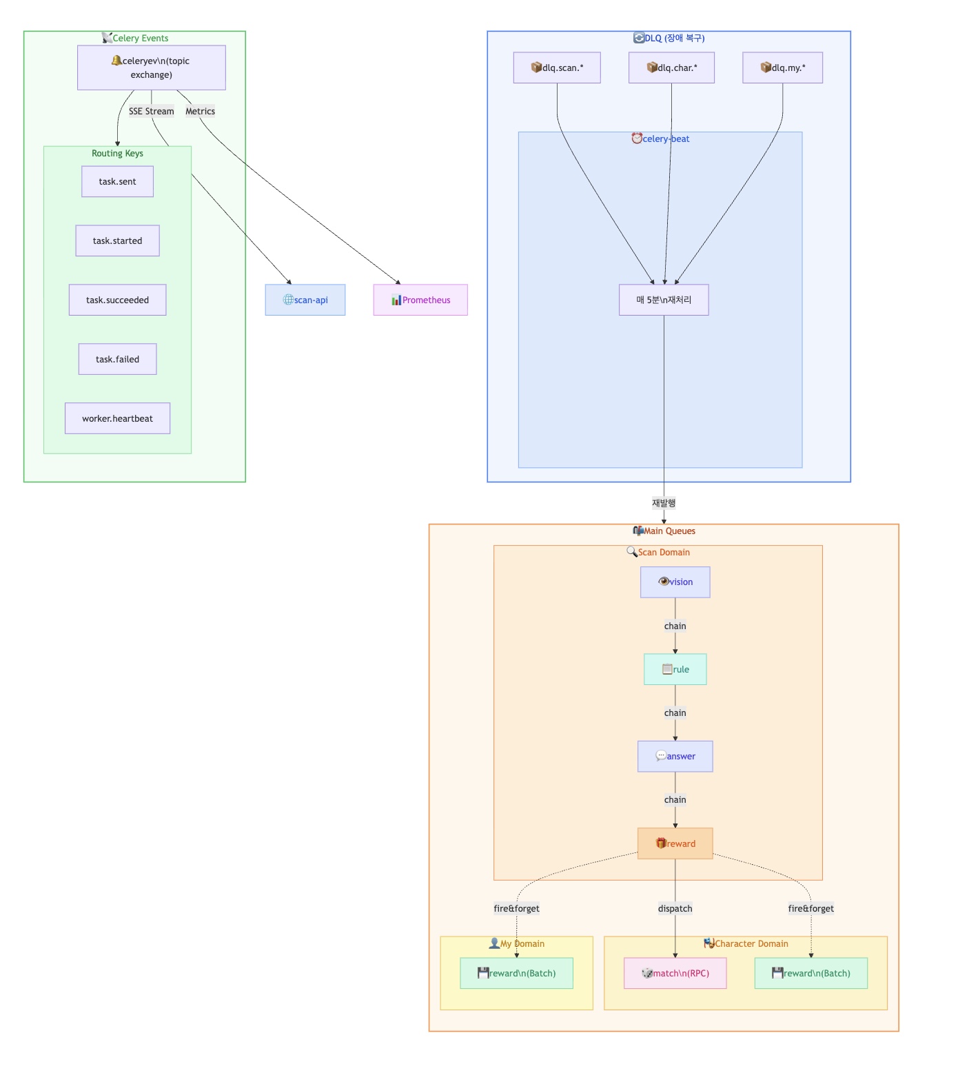 OpenAI 동기 호출 OpenAI Batch API (50% 비용 절감) Rate Limit 500 RPM Tier 업그레이드 or Multi-Provider scan-api HPA CPU 70% startupProbe 조정, 초기 replica 증가 캐시 규칙 DB 조회 Redis 캐싱 (rule 단계 최적화) Celery Chain 동기식 Task Chain, 큐 부하 LangChain/LangGraph로 경량화, run_id 단위 큐잉