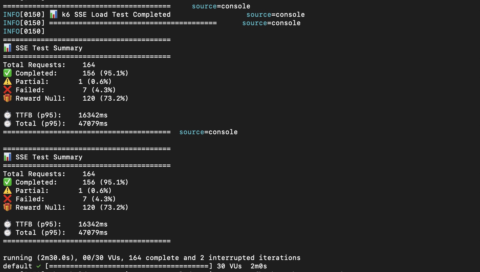 export const options = { stages: [ { duration: "60s", target: 34 }, // 0 → 34 VU ramp-up { duration: "90s", target: 34 }, // 34 VU 유지 { duration: "30s", target: 0 }, // ramp-down ], thresholds: { http_req_failed: ["rate<0.3"], // 실패율 30% 미만 sse_total_duration: ["p(95)<30000"], // 95%가 30초 이내 sse_ttfb: ["p(95)<8000"], // TTFB 95%가 8초 이내 }, };